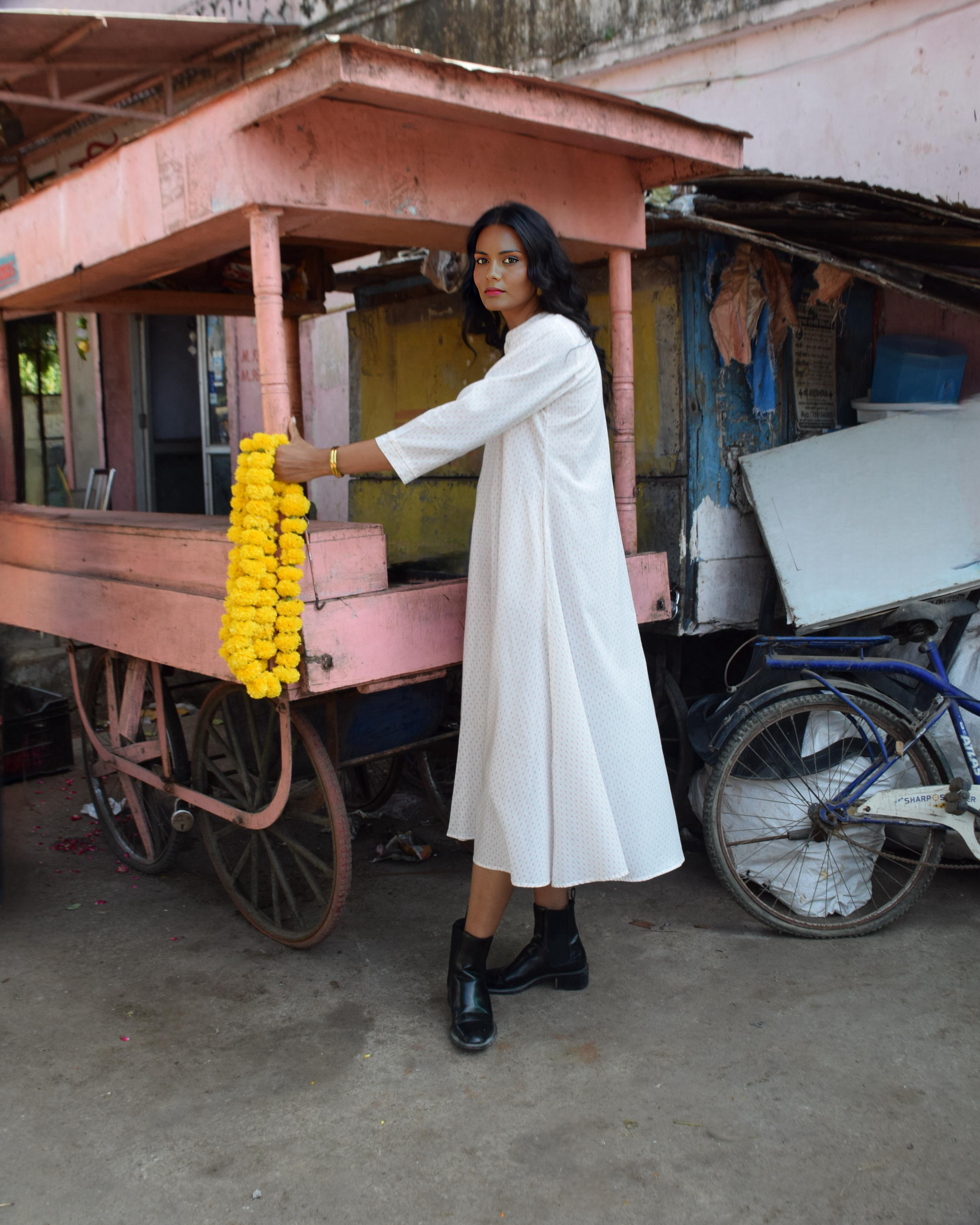 Step out in style with our Ivory Printed Flared Cotton Dress – a perfect blend of comfort, grace, and versatility. Crafted from high-quality breathable cotton, this dress features a subtle all-over micro print on a soft ivory base, making it ideal for everyday wear as well as casual outings.