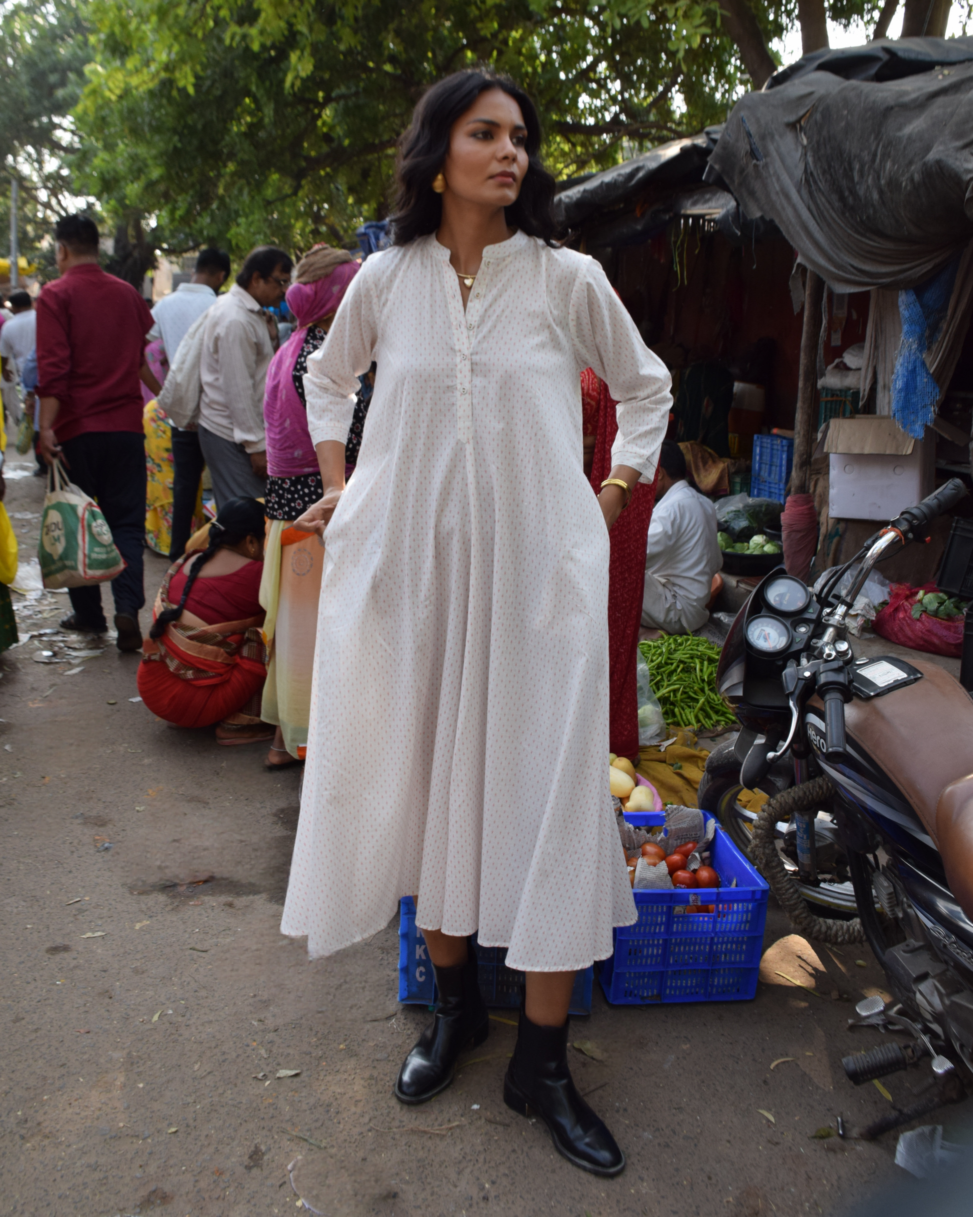 The dress comes with a flattering band collar, front button placket, and full-length sleeves for a structured yet flowy look. Its wide flare adds beautiful movement, while the practical side pockets bring in a touch of modern utility.